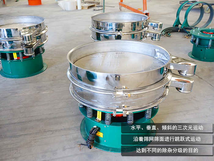 橡膠粉一般分為粗膠粉0.425mm(40目)以上、細(xì)膠粉0.425mm—0.180(40—80目)、微細(xì)膠粉0.180—0.075mm(80—200目)。DH系列旋振篩通過立式振動電機(jī)作為振動源,在篩分過程中將電機(jī)的旋轉(zhuǎn)運(yùn)動轉(zhuǎn)變?yōu)樗?、垂直、傾斜的三次元運(yùn)動,再把這個運(yùn)動傳遞給上端的篩面進(jìn)行橡膠粉篩分。將篩分的橡膠粉沿著篩網(wǎng)篩面進(jìn)行跳躍式運(yùn)動,再通過篩面上不同尺寸大小的網(wǎng)孔分級過網(wǎng),以達(dá)到不同的除雜分級的目的。篩網(wǎng)層數(shù)高可達(dá)到5層,可滿足不同規(guī)格的分級除雜。