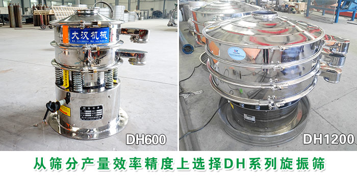 DH系列旋振篩型號齊全產(chǎn)量大,型號分為直徑400mm型、600mm型、800mm型、1000mm型、1200mm型、1500mm型、1800mm型、2000mm型等八種標(biāo)準(zhǔn)機(jī)型。篩分分級橡膠粉處理量可達(dá)400kg-2T/h,可將物料沿著篩網(wǎng)篩面充分篩分,過網(wǎng)率高篩分精度可達(dá)95%。