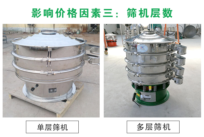 煙草振動(dòng)篩分機(jī)材可安裝1-5層篩網(wǎng),可同時(shí)進(jìn)行2~6個(gè)等級(jí)的分選或過濾,不同的層數(shù)有著不同的篩分目的,單層只能簡單的篩分過濾,多層則可以完成分級(jí)除雜等篩分效果。安裝多層篩網(wǎng)的肯定會(huì)比單層篩網(wǎng)的貴一些。差價(jià)在1000元以上。